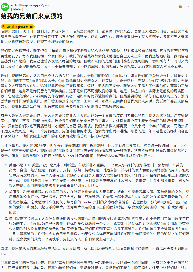 http://reddit.com/r/Healthygamergg/comments/16ewwol/tough_love_for_my_dudes/?tl=zh-hans Agreed.